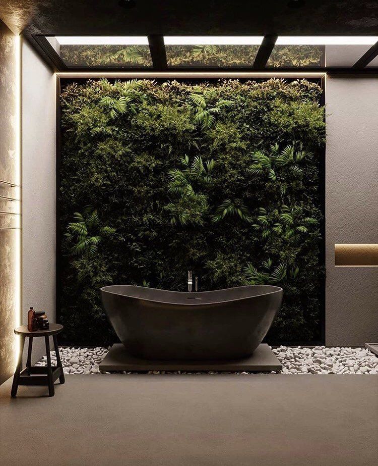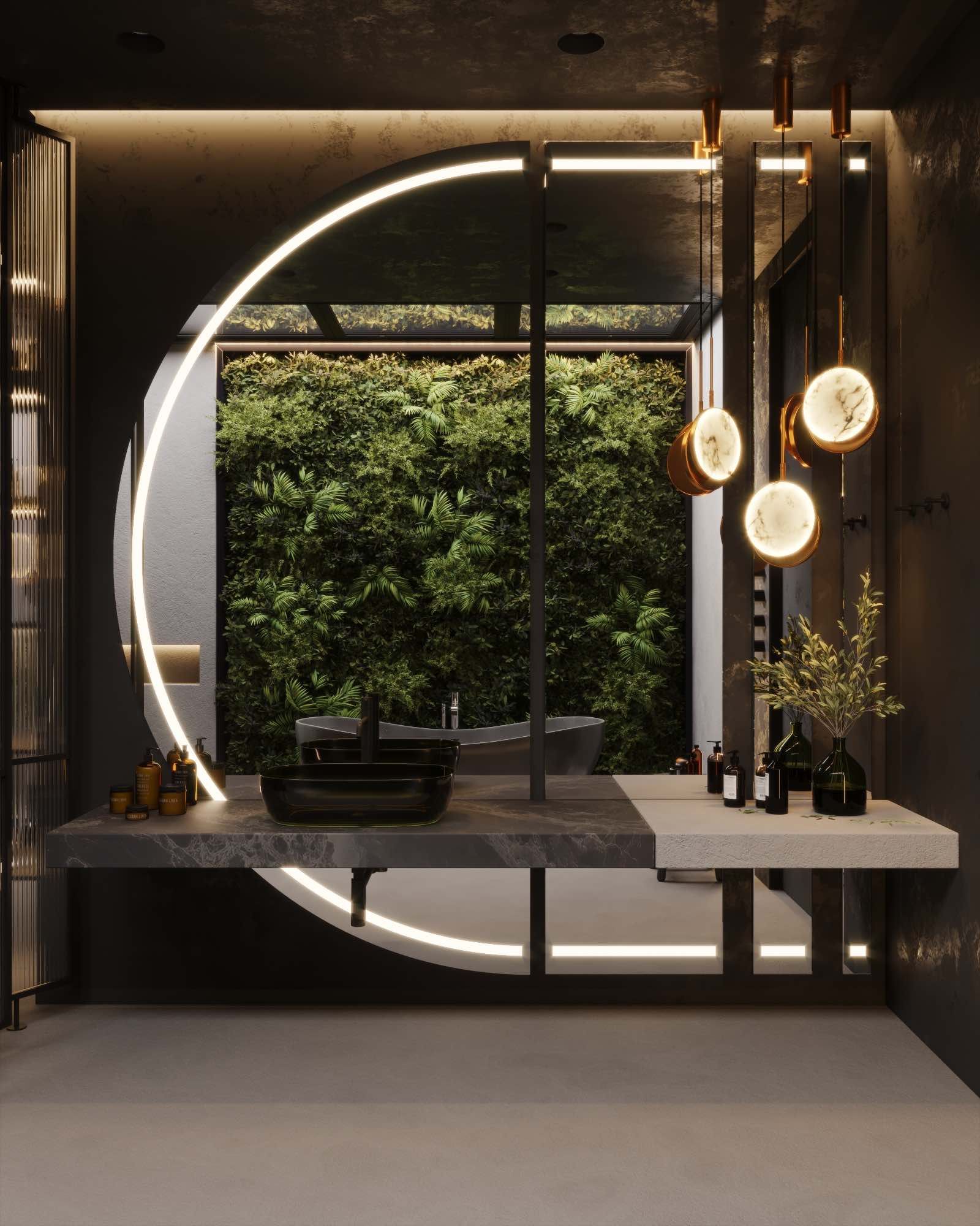 초록색인 식물과 어두운 계열의 나무, 돌 느낌의 검정 세면대가 잘 어우러져 자연을 연상시키며, 은은한 고급스러움을 보여줍니다.